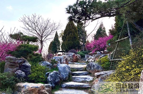运用山石点缀园林空间,比如:路石、驳岸、挡土墙、石矶、踏步、护坡、花坛,既造景又具实用功能;石材的机理及质感在环境中可起到点晴作用,使园林空间层次感及深度得以加强。