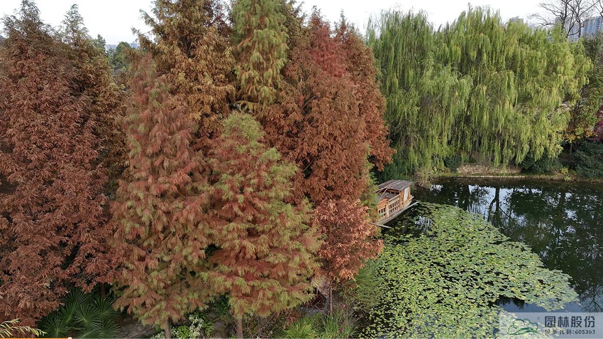 金黄的无患子、绚丽的红枫、黄红变换的枫香构成了画境园初冬缤纷世界的三部曲。半岛的乌桕、池塘对岸的水杉水松池杉混交林,则如跳动的音符,共同谱写着初冬的乐章。